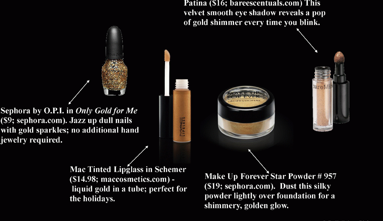 What I love about gold is its ability to spruce up anything boring with its shimmery brilliance. Used sparingly, gold makeup adds a touch of sparkle to highlight your inner radiance. And, with the gloomy, winter weather fast approaching, it just might be the perfect thing to add that extra boost of sunshine to your day.