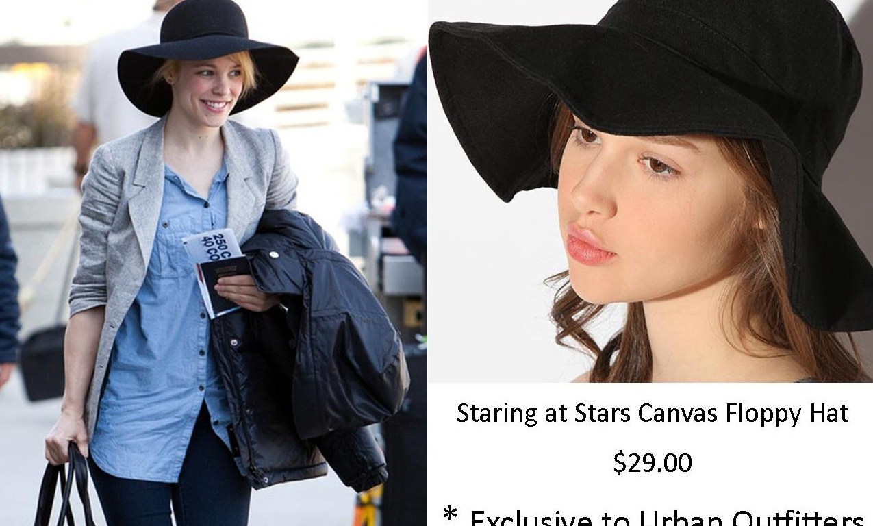 Rachel McAdams wore a black floppy sun hat at the airport. You can get a similar hat at Urban Outfitters. Floppy sun hats are an essential summer accessory, and are a chic way to prevent your skin from being damaged by the sun.