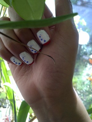 Since our nations flag is red white and blue, I made sure the colors were reflected prominently in the nail designs. I first painted my nails with a base coat and then color. For the first design I chose a blue base, and for the second design I chose to use white as my base color.