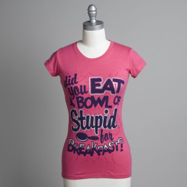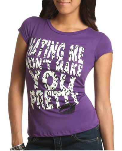 I found it really interesting to learn this week that JC Penny yanked a graphic t-shirt off its website after public outrage that it sent out the wrong message. The shirt reads, “I’m too pretty to do my homework so my brother has to do it for me,” and caused uproar by consumers who claimed that it sent out the wrong message to girls. They believe the phrase on the t-shirt perpetuates the idea that a girl can’t be both smart and beautiful. When I first viewed the shirt, which is marketed to girls between the ages of 7-16, I honestly didn’t think twice about it or feel offended. I don’t believe a girl wearing that shirt will start believing the phrase to the point that she will stop doing her homework, or feel that she is too pretty to focus on school. And, I really don’t believe that this one t-shirt, amongst the hundreds of graphic shirts out there on the market, should be especially targeted for its phrase. Some shirts say things that are much worse (check out some of the ones below). At the end of the day, it comes down to freedom of speech, and if you don’t like a phrase on a t-shirt, just don’t buy it.