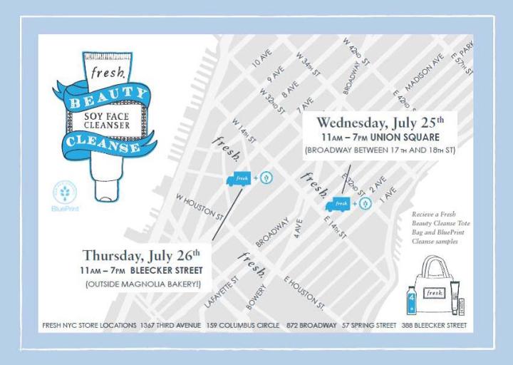 This week in NYC, take a break from summer’s soaring temperatures, and stop by the Fresh Beauty Cleanse Pop-Up Truck. As an introduction to the Fresh Beauty Cleanse campaign, the truck will be stationed in two different locations (see map below) on July 25th and 26th, giving visitors the opportunity to learn more about the benefits of the company’s new Soy Face Cleanser, while enjoying BluePrint’s signature Spicy Lemonade.