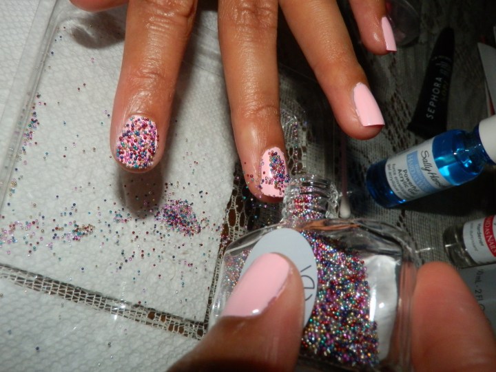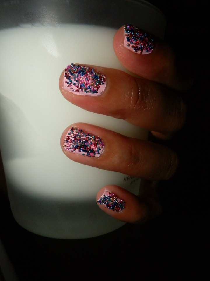 - Hours after the manicure, the beads began to fall off. By the end of day 2, it looked like a greedy little kid had picked all the sprinkles off of a cupcake and left behind the evidence of little colored stains.
