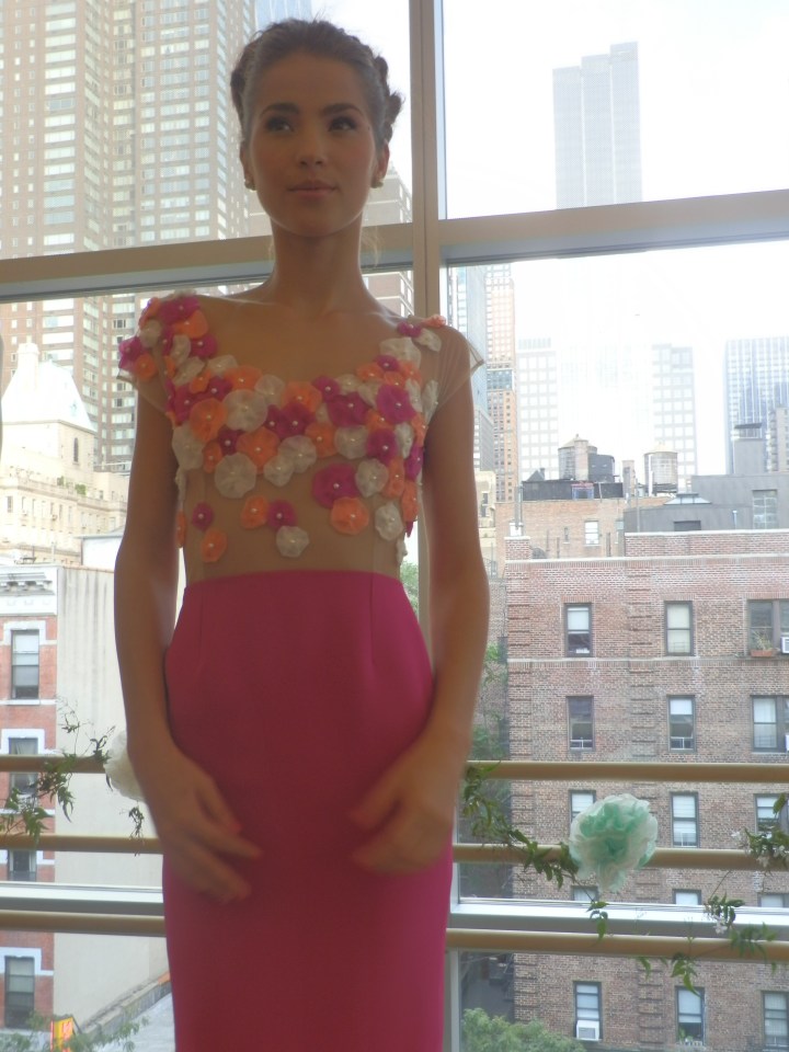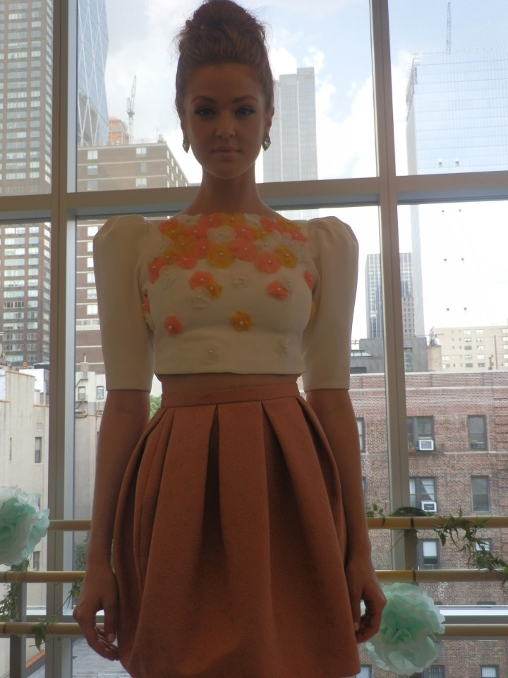 On Friday, September 7th, I attended the Spring/Summer 2013 fashion presentation of By Misha. I love the whimsical themes of By Misha’s collections. The Autumn/Winter 2012 line, Crown Jewels, was fairytale-inspired (read my review of that collection here). The theme of this year’s collection is Wishing Well, and features charmeuse and chiffon fabrics in shades of honeysuckle, mint, forest, marmalade and crème brulee. Beautiful organza pearl flowers stood out as a strong characteristic of this collection, as they adorned romantic dresses, skirts and tops. Modest sequin detailing is also prominent in some of the clothing in Wishing Well. Hey, a girl’s got to have a little sparkle.