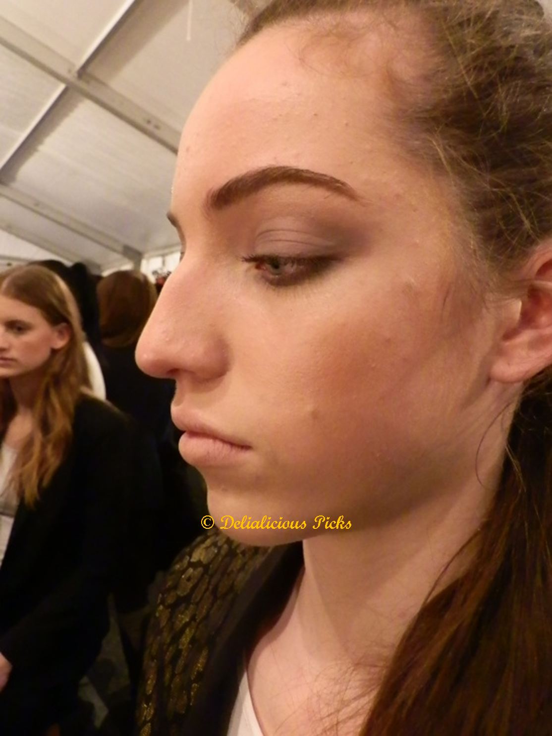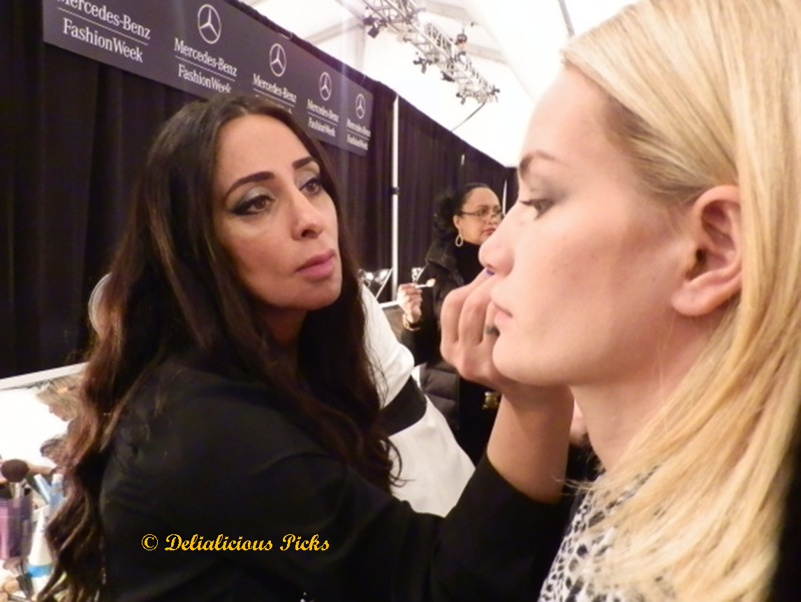 On February 9th, I had the amazing opportunity to go backstage at Alon Livne’s show held at Lincoln Center as part of Mercedes-Benz Fashion Week. Lead makeup artist Suzana Hallili explained that Livne wanted the models to look solider-like, an effect she created by emphasizing strong brows and grey, smoldering eyes. Gun Metal eye shadow, custom-made by Mob Wives’s star Love Majewski in collaboration with Hallili and Richard Anderson, was used on the upper and lower eye lids. Strong brows were defined with per-fekt brow perfection gel ($22), while nude lips made sure the model’s eyes remained the focus of attention. For luminous skin, skin perfection gel ($57.50) was used as a base all over the face, and cheek perfection gel in bronzed ($28) accentuated cheekbones.