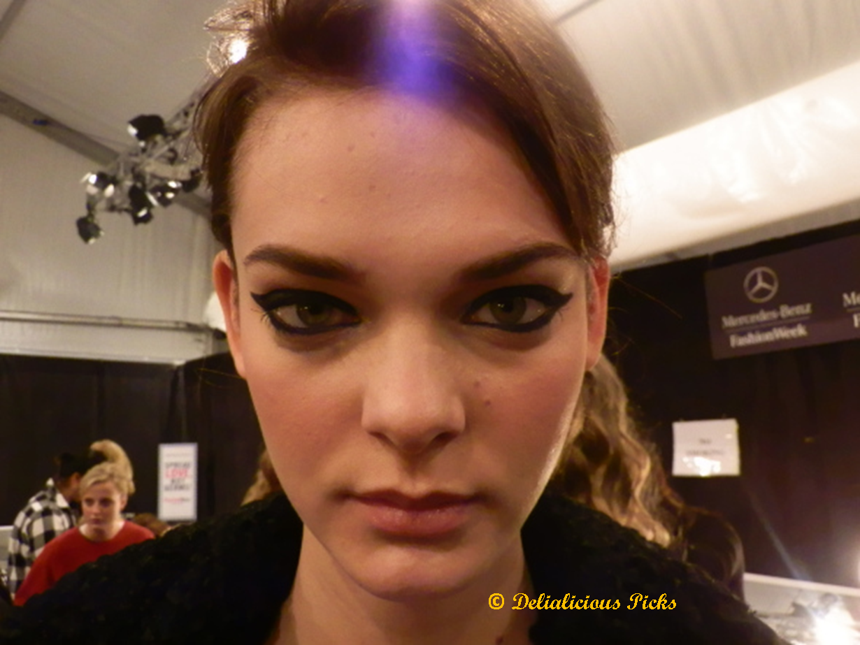 All of the make-up used for the show was by Bobbi Brown. Dark, rocker-chic cat eyes were created using Bobbi Brown’s Long-Wear Gel Eyeliner in black. And, the top of brows here highlighted using Bobbi’s limited edition Sparkle Eye Shadow, a combination of shimmering pearls and fine glitter. Similar to the hair, the makeup was done to look as if the model did it herself.