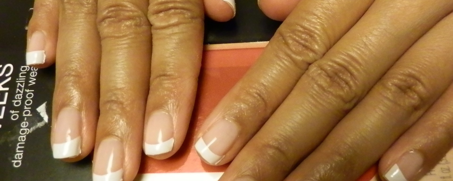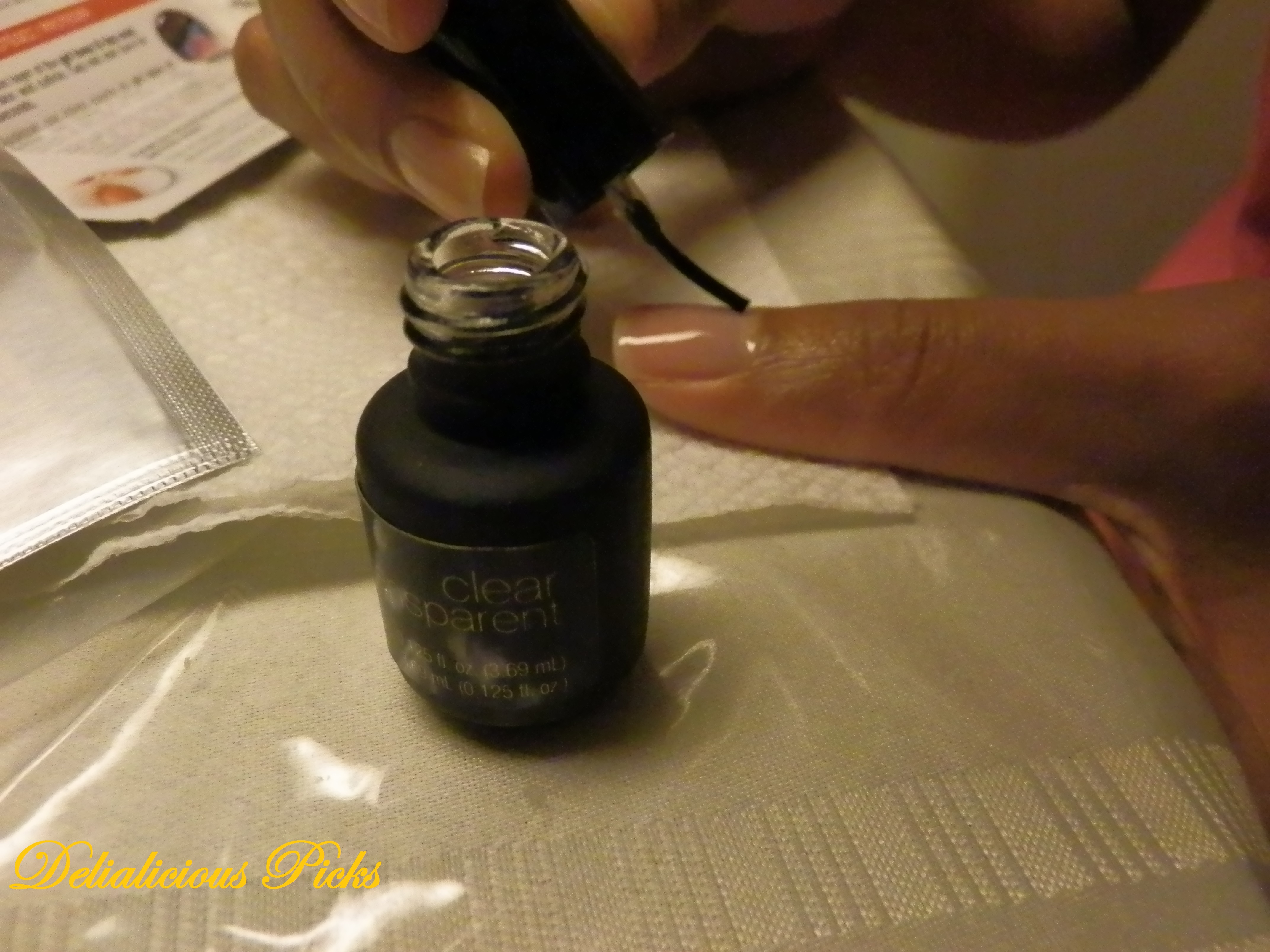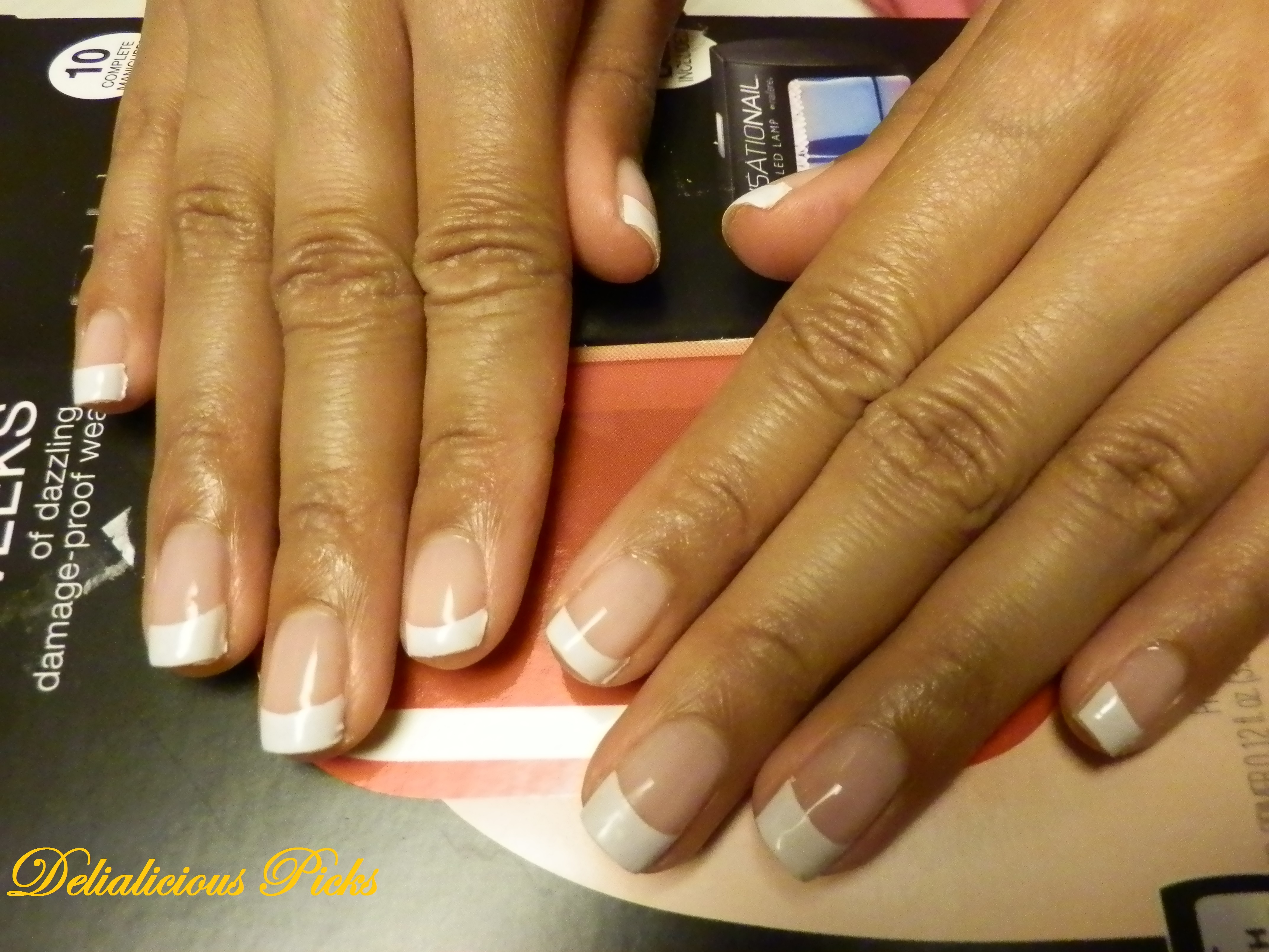 The French kit comes with separate tips that must be applied after the gel has set. If you are doing French, DO NOT follow Step 6. Go right into applying the white tips. The tips are rather sticky; you must be very careful when using them….they stick to anything! They stuck to the table that I was working on and they are very hard to remove. So, be sure you have paper towels or a newspaper under our hands when working. It was very difficult to select the right size tip for my nail which caused me to have to trim and take extra time to get the French just right. After you have selected your tips and they are on (hopefully you didn’t create a sticky mess like me!) you can apply the top coat.