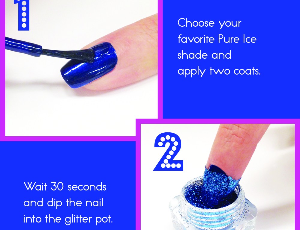 To Use: Swipe on 2 coats of desired Pure Ice polish shade, Let nail polish dry completely. Dip nails into selected Glitter Pot. Press firmly onto the covered nail and dust off excess glitter. Seal with top coat if desired. See the infographic below for complete instructions.
