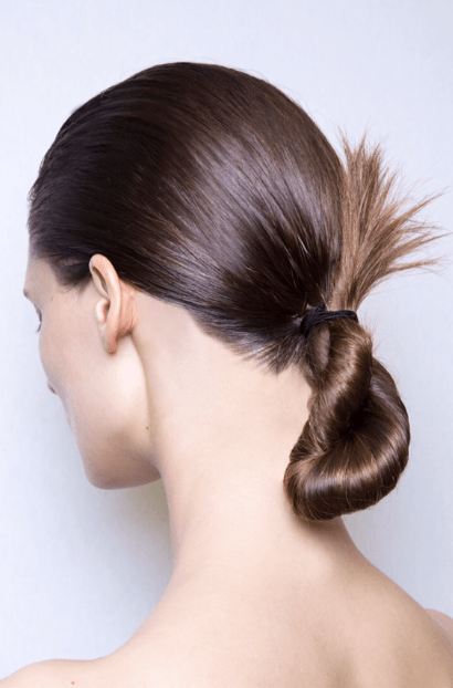 4. Twist ponytail into a messy chignon and secure with open fasteners