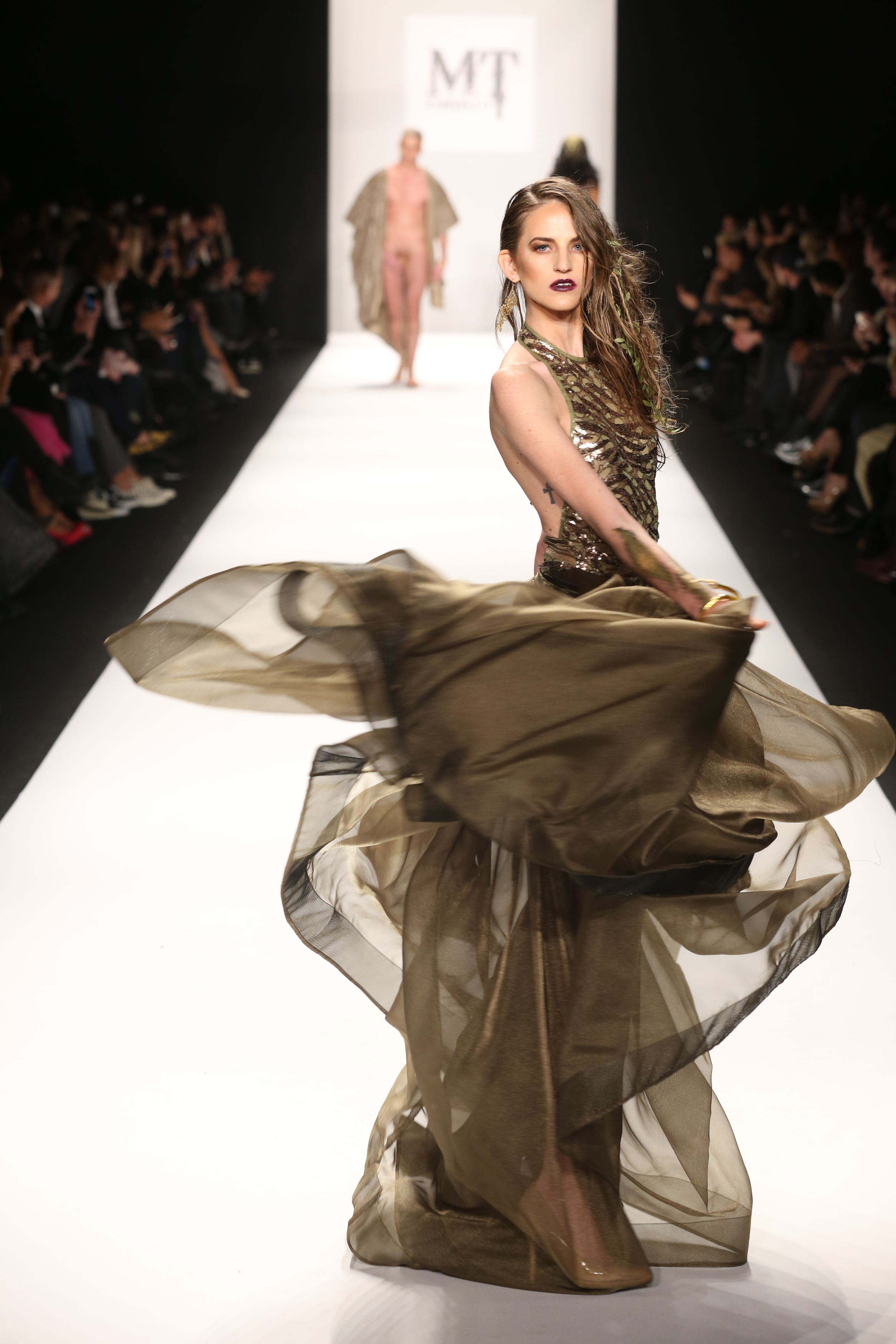 Finally, MTCostello’s immaculate collection of gowns were absolutely breathtaking. His showcase of designs proved to be a crowd pleaser, opening with a model wearing a reptilian face makeup and a solo male model who walked down the runway wearing nothing more than a golden robe and covering his manhood with his hands.