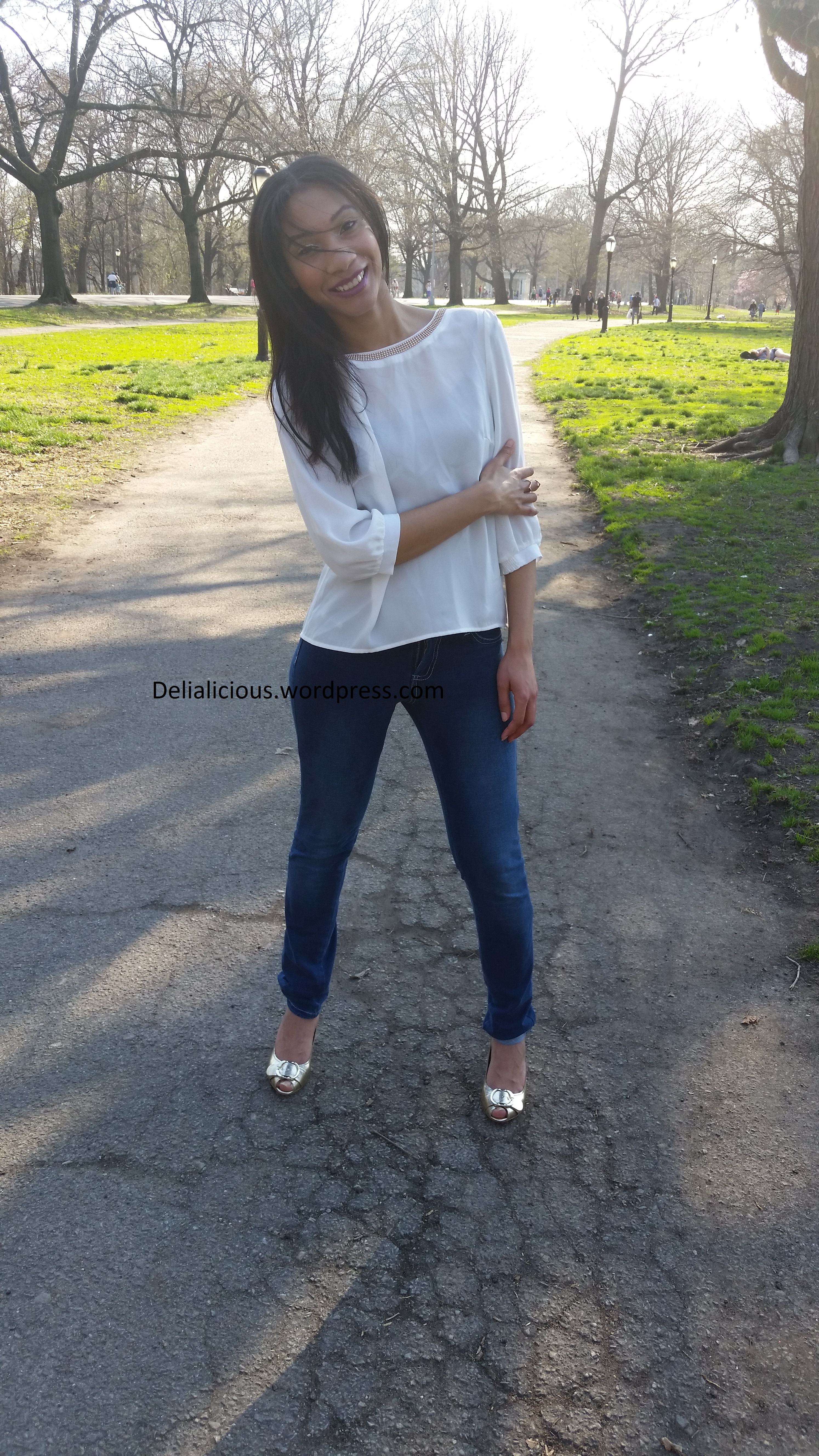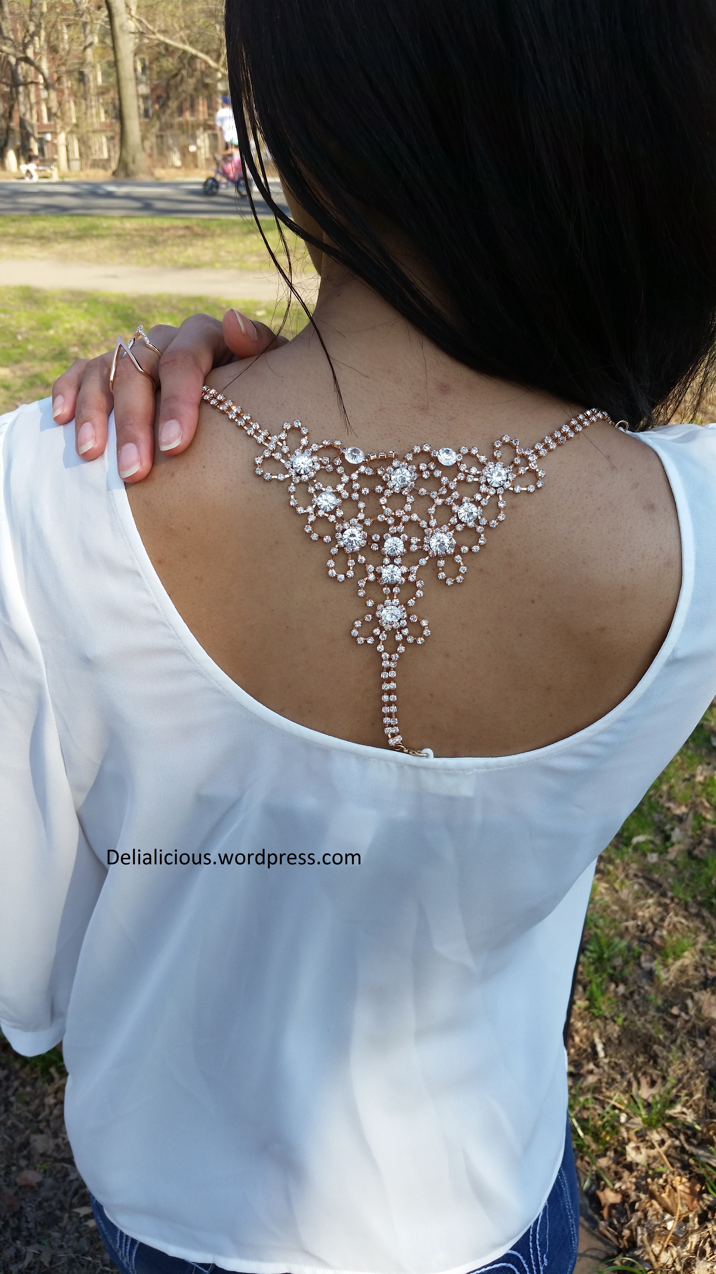 Spring has been cold here in NYC, which has me yearning for the warm summer months. I got excited when the weather warmed up enough over the weekend so I could wear a new top i just bought from Steps New York. The flowy chiffon fabric moves swiftly as I walk, allowing the spring breeze to seep through and cool me down. The most gorgeous part of the top has got to be the back, which features a chain embellishment that accentuates the upper back. The chain can be removed and worn as a necklace, bracelet or headpiece, so it’s multifunctional.