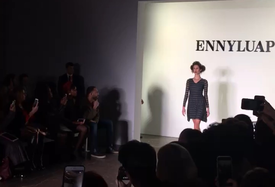 Without a doubt one of the shows I was most eager to attend this season was that of Ennyluap. Founded by Amanda Williamson, who was named a Forbes 30 Under 30 nominee for Art &Style for 2017, the brand first debuted at New York Fashion week in 2013, and now 5 years later, continues to wow admirers such as myself, with its timeless collection of contemporary womenswear. After attending several shows before this one, it was easy to get caught up in the glitz and glamour of fashion week presentations, and I was almost startled to see a line of clothing that actually looked wearable off the runway. There was an elegant display of blouses, dresses, pants, and skirts. Dark greys, burgundy and muted red were strongly present, almost as a way of silently communicating that this collection is not for the woman who wants to boldly stand out in a crowd; it’s for the woman who wants to be noticeable only to those she chooses. Notable highlights in the line included a black and white wide-legged jumpsuit, which featured ruffles at the shoulder; a stripe and mesh long-sleeved cocktail dress, and the closing number: a regal, gold and red mini dress. To see a video of the collection, check out my Twitter page.
